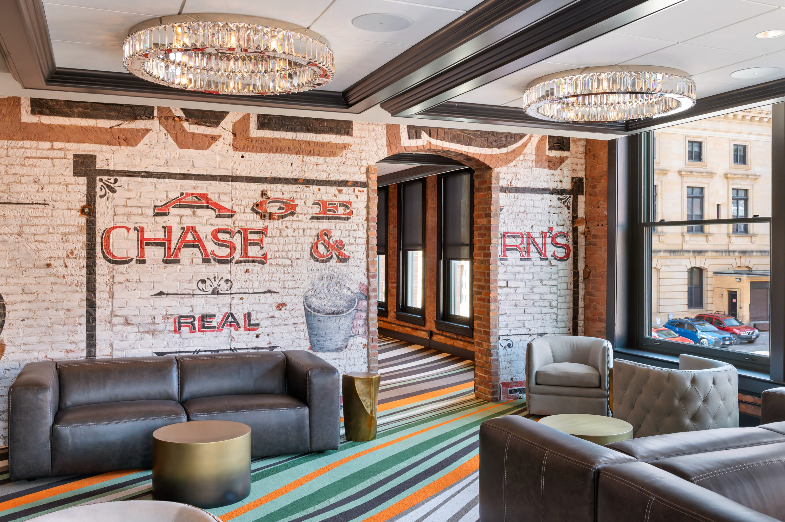 This unique, contemporary space houses a full-scale bar and can host gatherings of up to 150 guests. Named after W.E. Adams himself, this room is filled with plush, unique seating options, custom lighting, carefully restored wall murals, and a stunning view of our two-story installation, Raining Gold, as well as beautifully restored large-scale windows to enjoy Historic Sherman Street, Outlaw Square, and the Black Hills beyond.